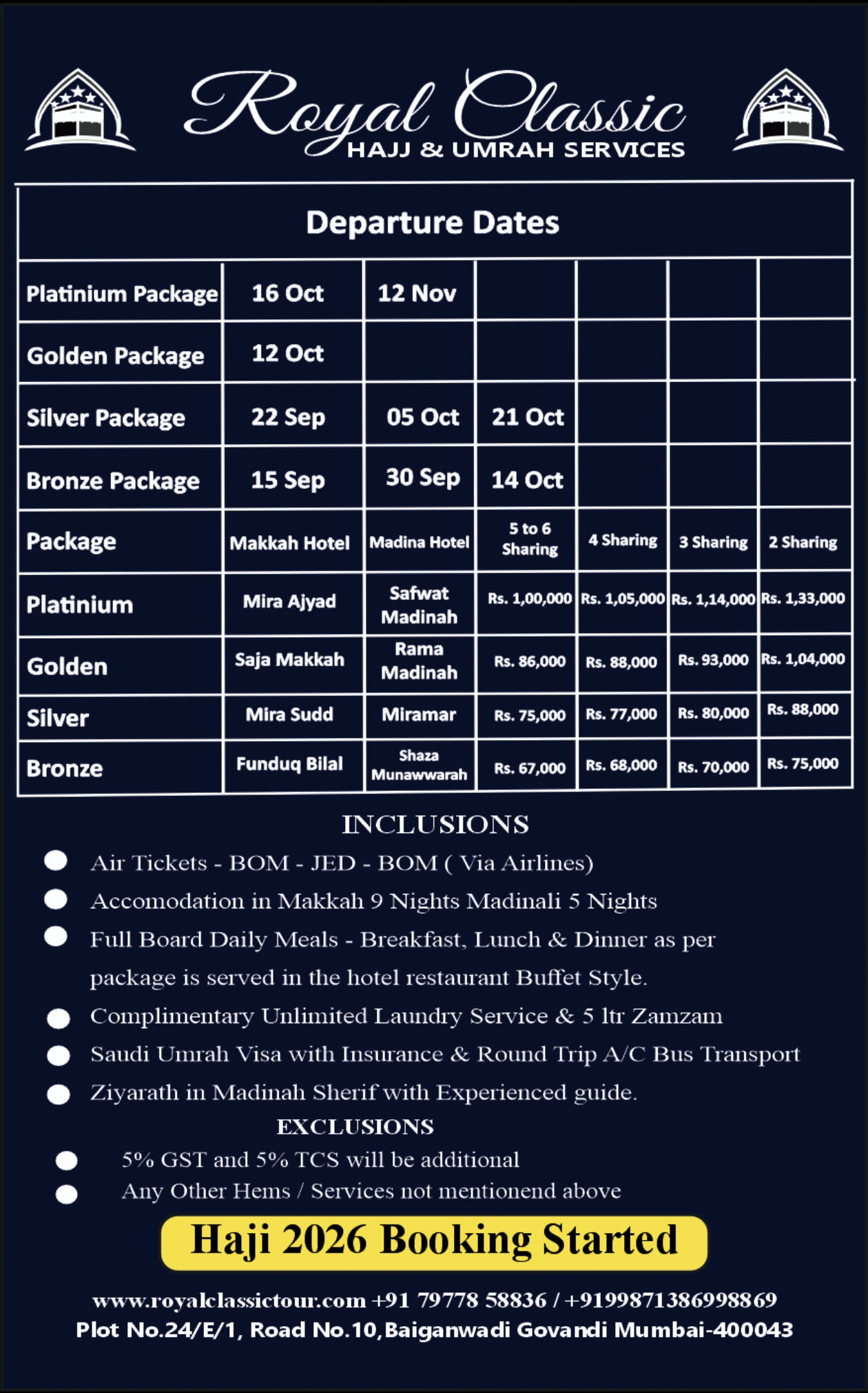 Royal Classic Hajj & Umrah Services provides a complete one-stop solution for all your Umrah needs. We understand that every Muslim aspires to perform the blessed journey of Umrah, but many face challenges due to unorganized services, high costs, or lack of reliable guidance. Our mission is to make Umrah accessible by offering well-organized, affordable, and premium-quality packages designed to fulfill every pilgrim’s dream of visiting the Holy cities of Makkah and Madinah.